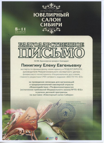 В г. Волгоград приняла участие в совещании по просьбе ФКУ Пробирной Палаты России для субъектов ювелирного сектора, поднадзорных Саратовской ГИПН территории (Саратовская, Пензенская, Самарская, Волгоградская, Астраханская области) по вопросам ПОД/ФТ/ФРОМУ с целью подготовки представителей ювелирной отрасли России к предстоящей в 2019 году оценки специалистами международной организации ФАТФ технического соответствия и эффективности системы ПОД/ФТ Российской Федерации с участием главного контролера Саратовской ГИПН Жиляевым Андреем Владимировичем. Выступила с докладом по теме исполнения обязанностей в сфере ПОД/ФТ