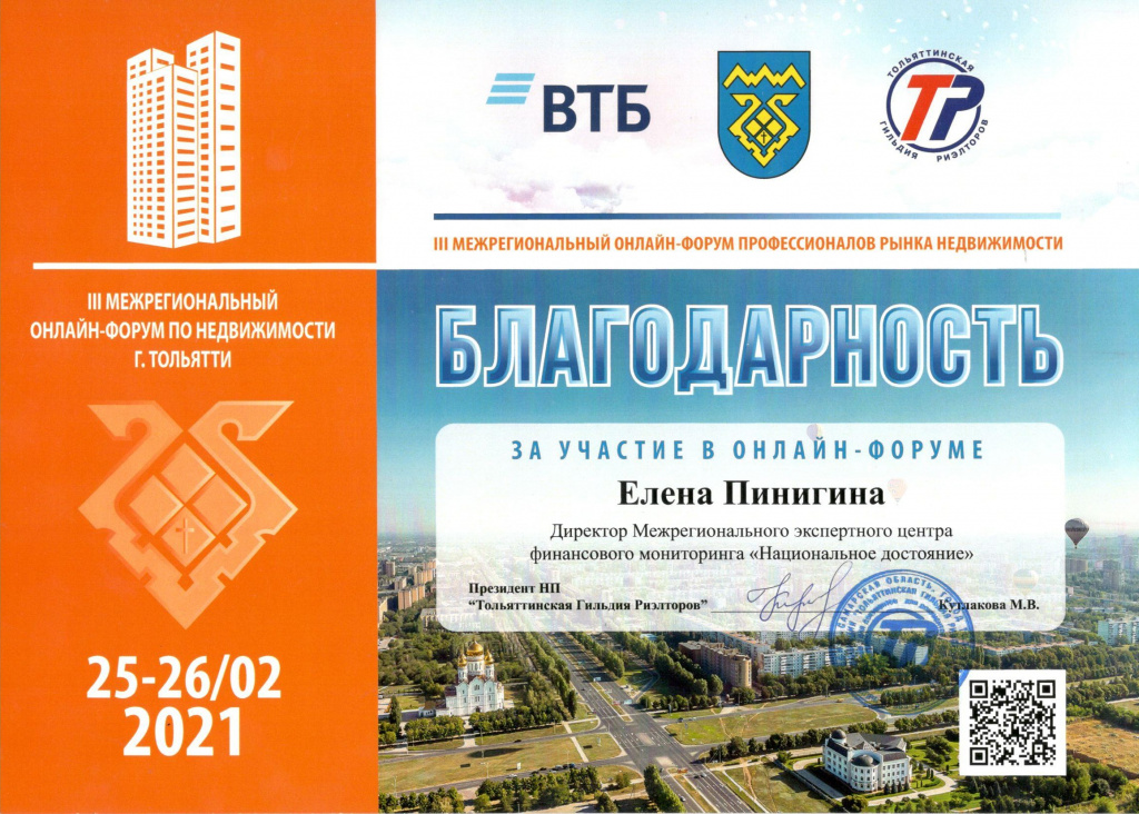 Выступила с докладом на III МЕЖРЕГИОНАЛЬНОМ ФОРУМЕ ПО НЕДВИЖИМОСТИ г.ТОЛЬЯТТИ в онлайн формате.170 человек зарегистрировались, а так же смотрели форум компаниями.
