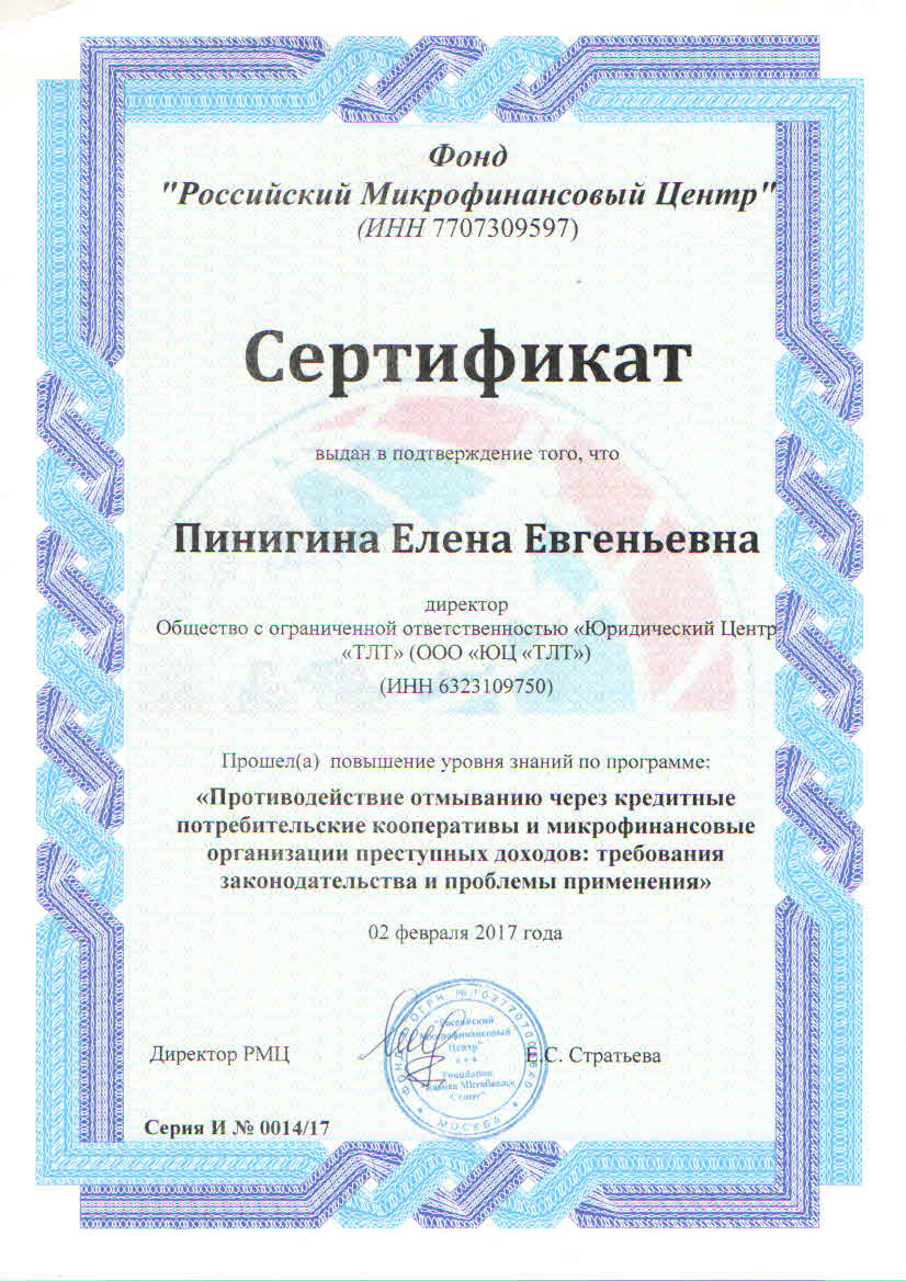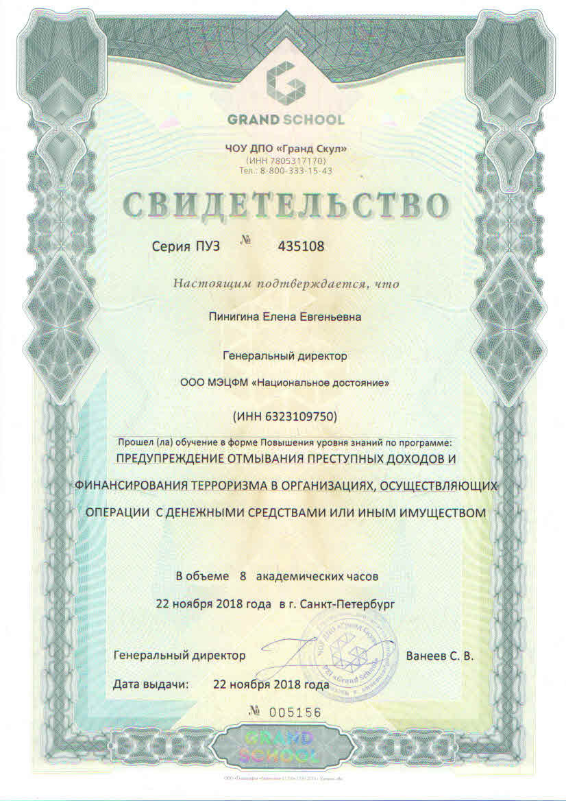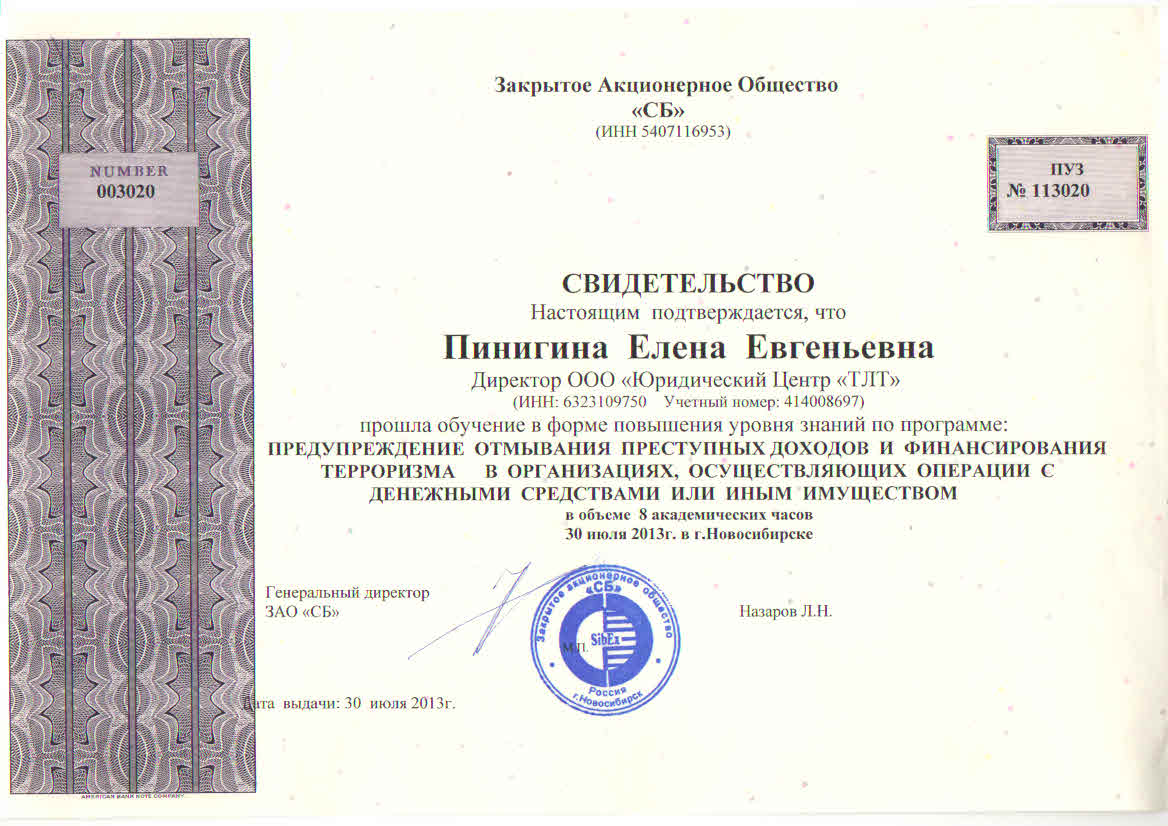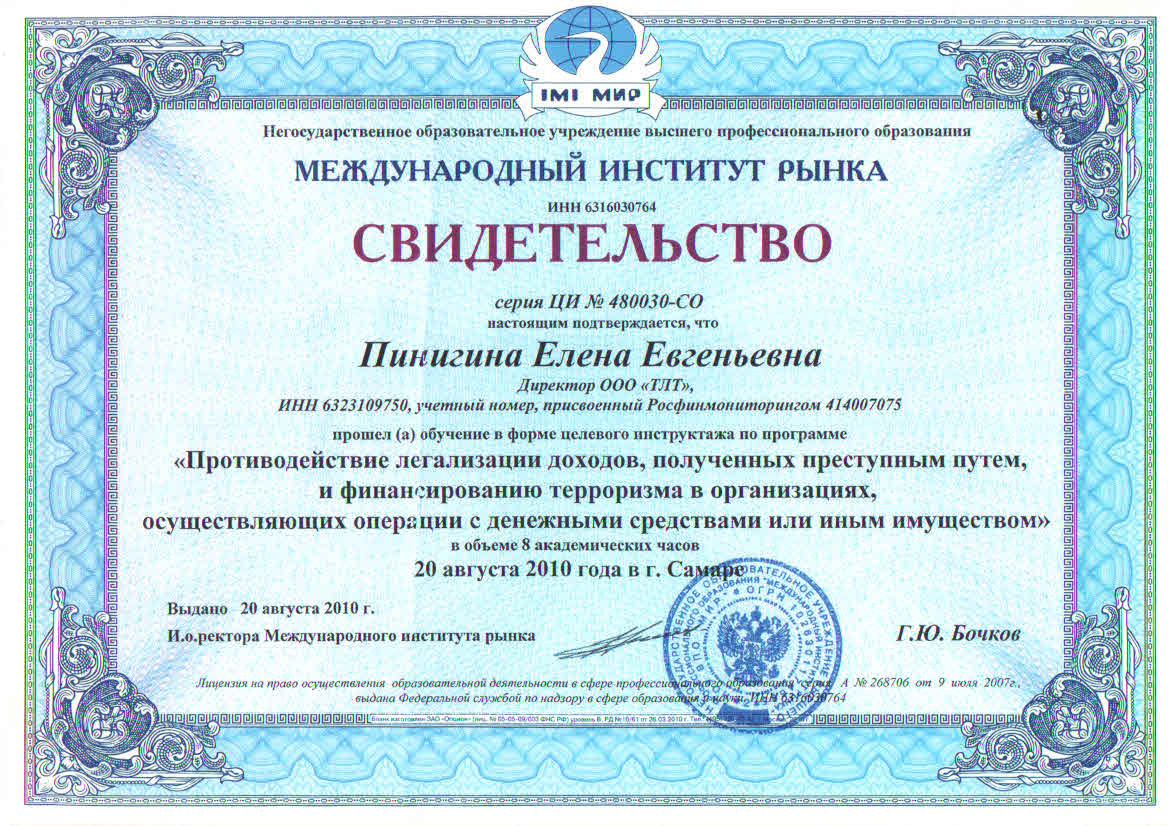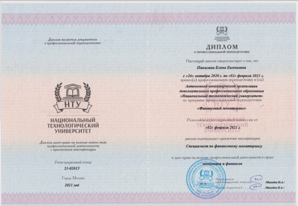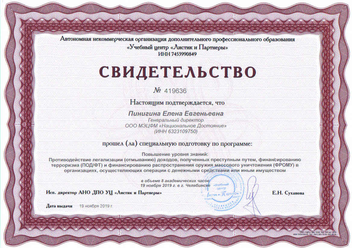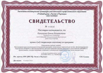 Специальная подготовка по программе повышения уровня знаний: «Противодействие легализации (отмыванию) доходов, полученных преступным путем, финансированию терроризма (ПОД/ФТ) и финансированию распространения оружия массового уничтожения (ФРОМУ) в организациях, осуществляющих операции с денежными средствами или иным имуществом» выдан в АНО ДПО УЦ «Листик и Партнеры».