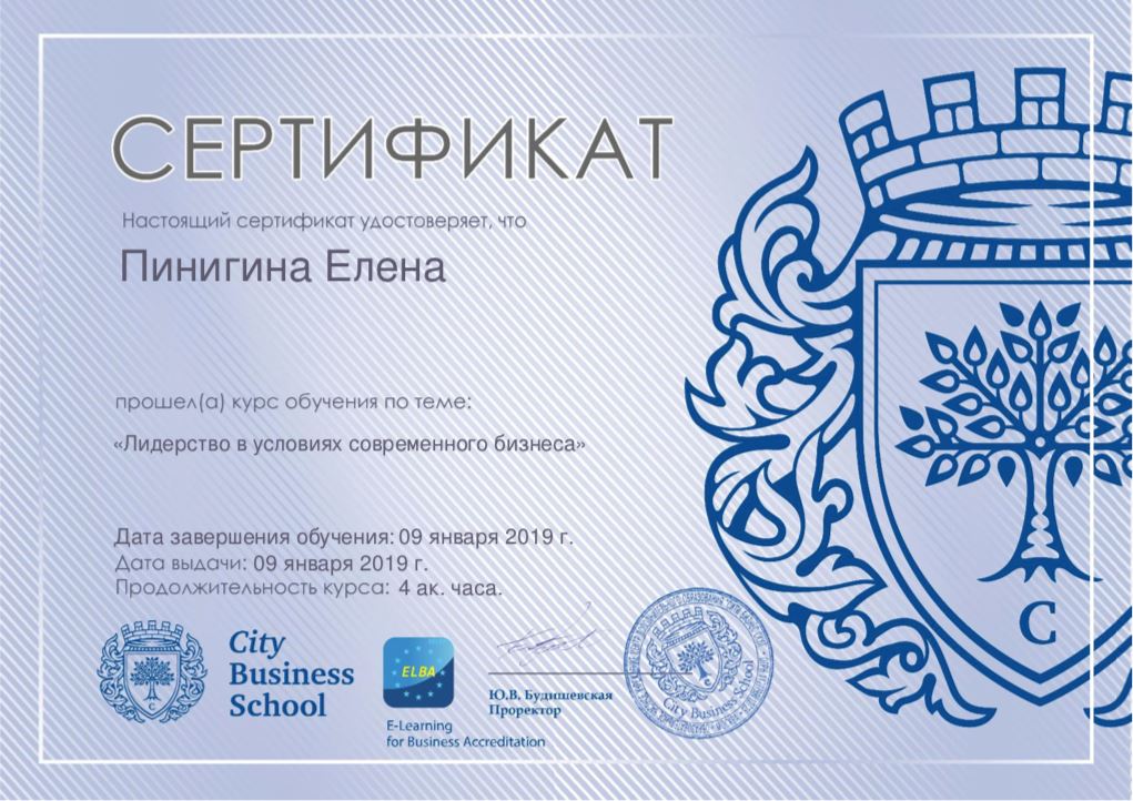 Сертификат удостоверяет, что Пинигина Елена прошла курс обучения по теме "Построение личного бренда руководителя"