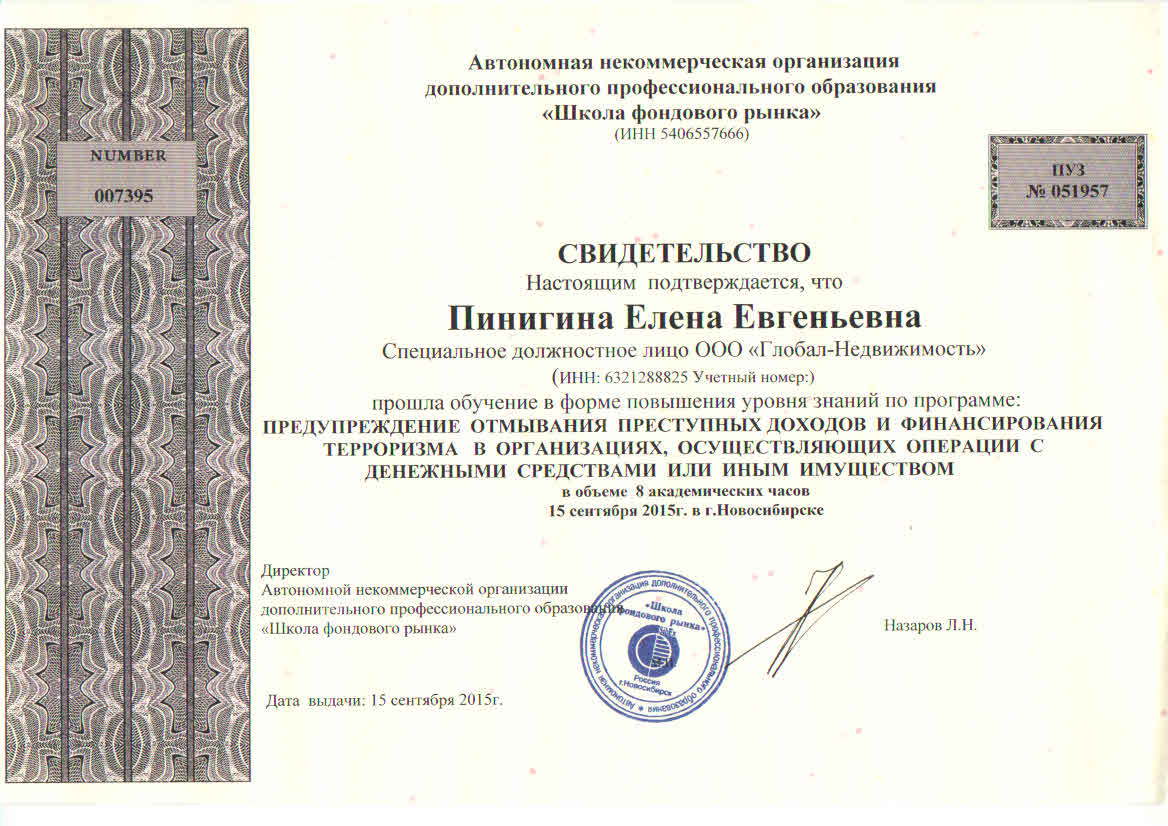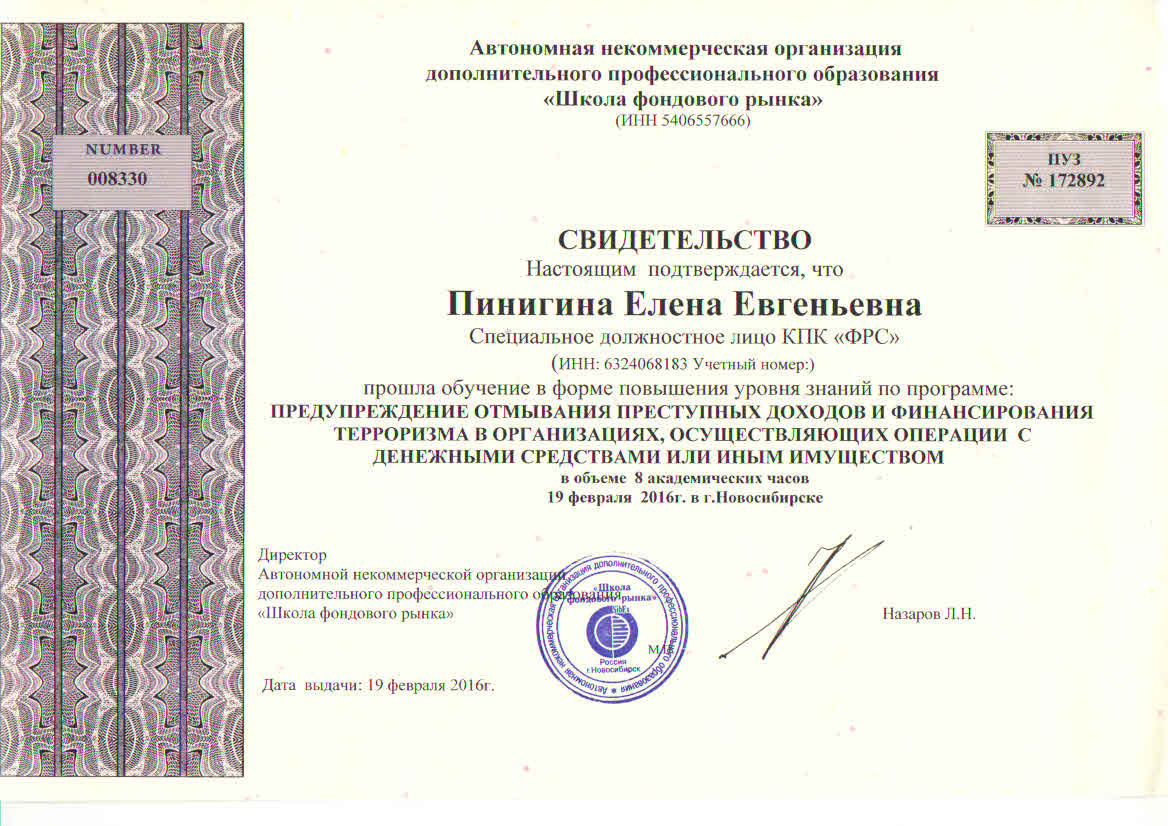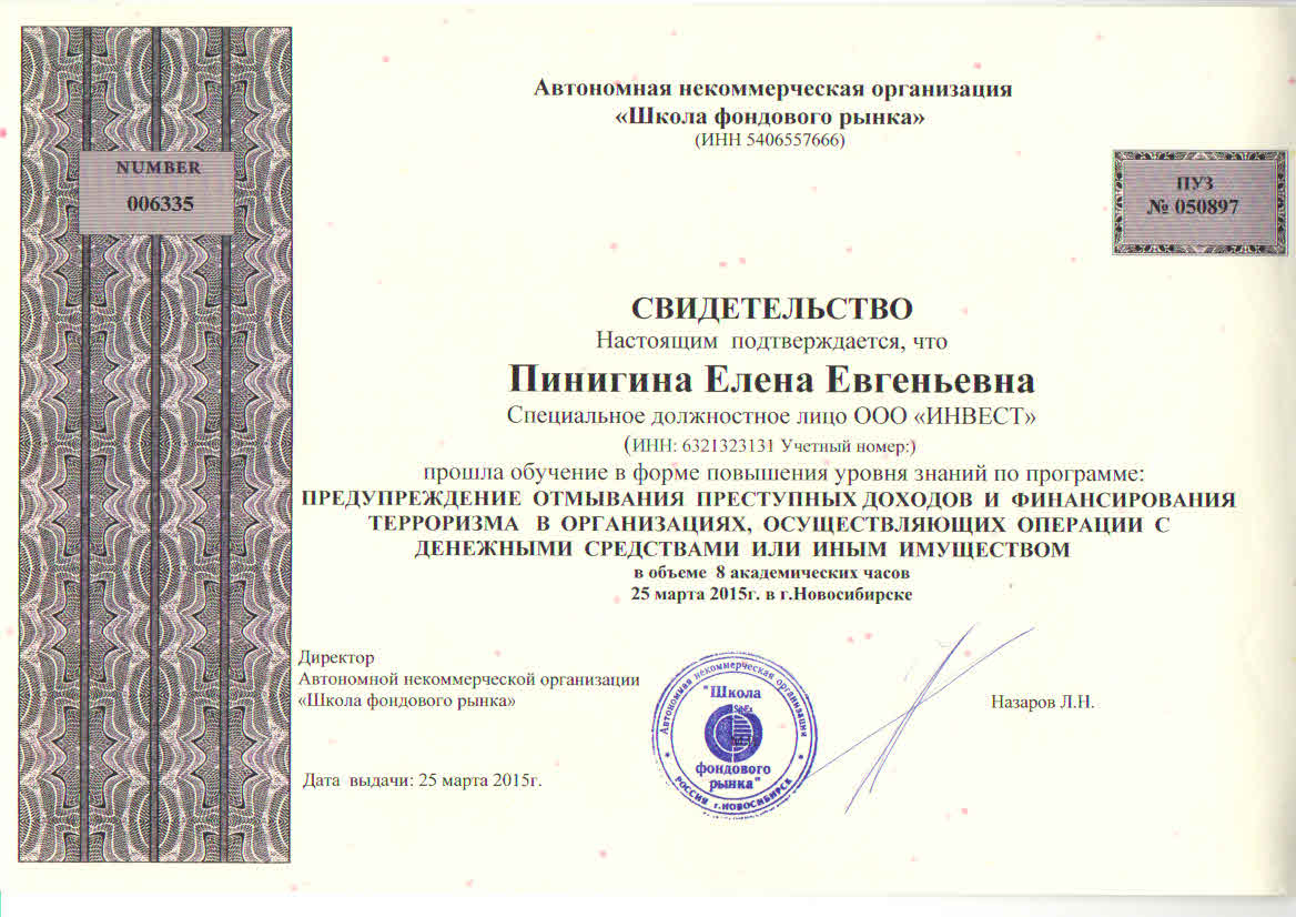 Обучение в форме повышения уровня знаний по программе: «Предупреждение отмывания преступных доходов и финансирования терроризма в организациях, осуществляющих операции с денежными средствами или иным имуществом» в Автономной некоммерческой организации «Школа фондового рынка».
